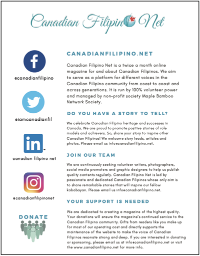 In another collaboration with CFNet, Dahon is carrying a full page ad for CFNet in its 2019 print and online editions. This is to help advertise the CFNet website and garner support and donations to enable CFNet to expand and continue publishing. The website was initially funded by three founding directors of the non-profit Maple Bamboo Network Society, CFNet’s publisher. CFNet now needs additional funds to develop new ways of telling the Canadian Filipino story to Filipinos and Canadians alike.